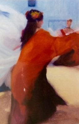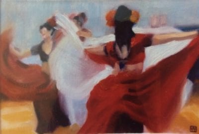 I am also interested in depicting movement by painting dancers using loose simple brush marks.  I use photos as the basis for this but deconstruct them so that the detail is kept to a minimum.  It can be difficult to know when to stop which is another thing that you learn as you go along.