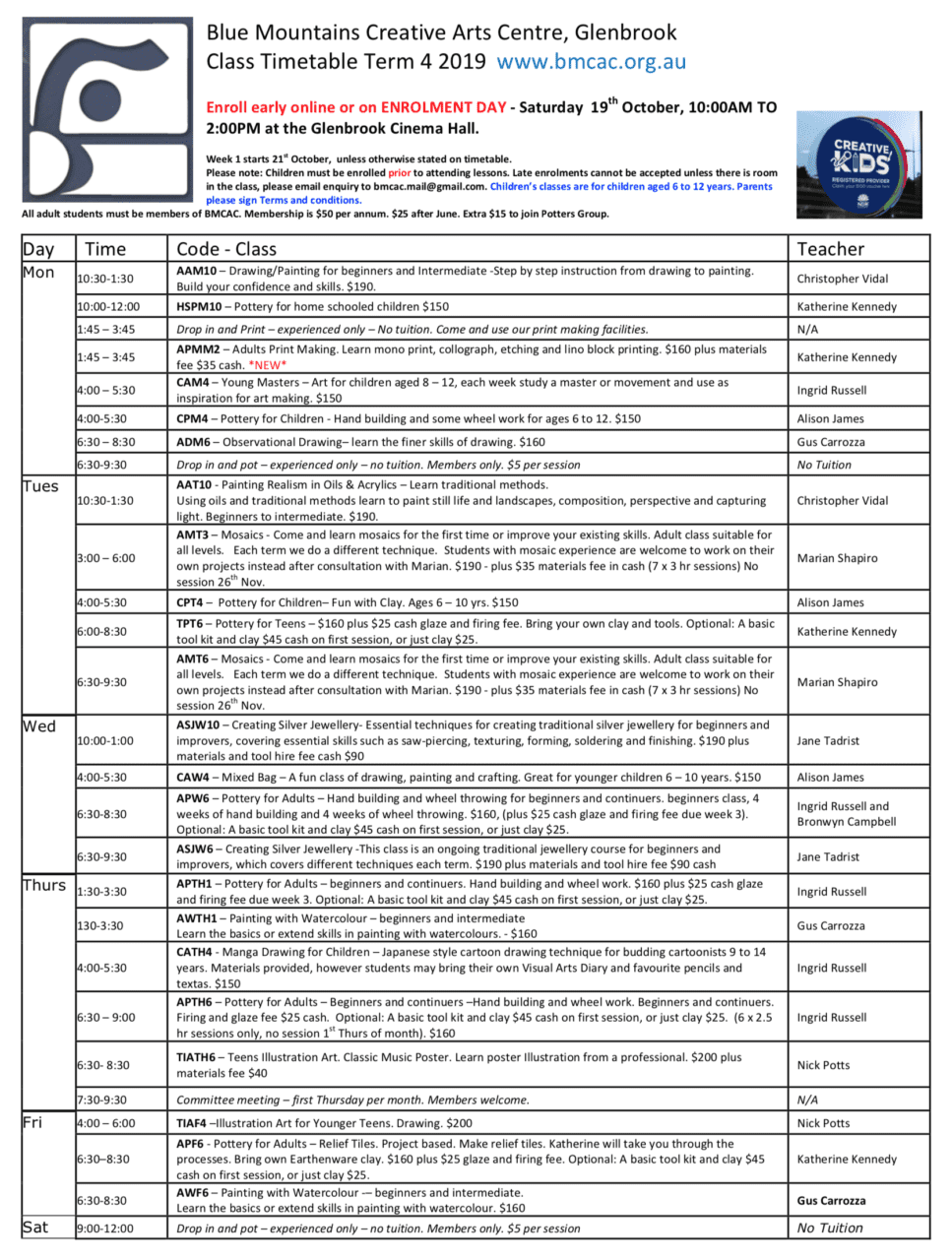 Online Enrolments open 20th September. All adults must be members of BMCAC before attending classes.